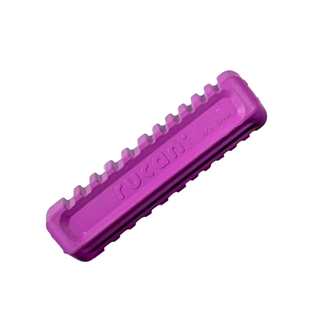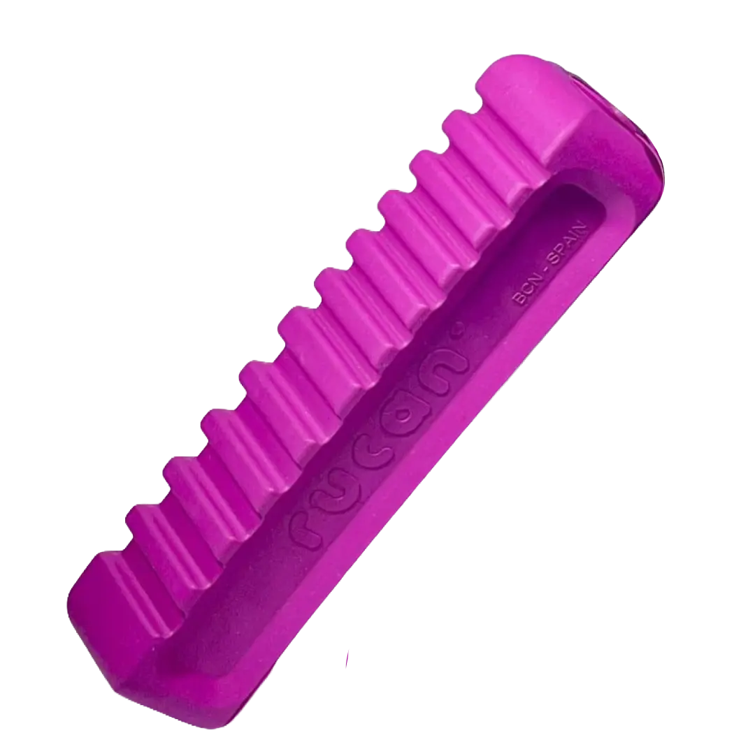 Su forma alargada y ergonómica lo convierte en un juguete ideal para la masticación, dado que el agujero central le da flexibilidad. Además, las ranuras en la superficie ayudan a eliminar el sarro al rozar los dientes con el caucho natural del producto, y permiten untar comida húmeda como premio, o dentífricos para el cuidado de dientes y encías.
