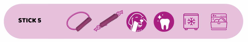 Nuestro Stick 5 L se puede complementar con una cuerda gracias a su cavidad central, y presenta una superficie en forma de ranuras que favorece la masticación y la limpieza de los dientes del perro. Se puede poner en el lavavajillas y el congelador.