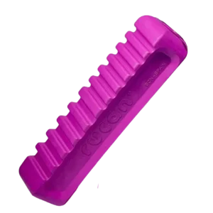 Su forma alargada y ergonómica lo convierte en un juguete ideal para la masticación, dado que el agujero central le da flexibilidad. Además, las ranuras en la superficie ayudan a eliminar el sarro al rozar los dientes con el caucho natural del producto, y permiten untar comida húmeda como premio, o dentífricos para el cuidado de dientes y encías.